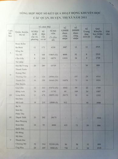 Ngày 29/12/2011, Hội Khuyến học Hà Nội đã tổ chức hội nghị Ban Chấp hành mở rộng nhằm tổng kết công tác năm 2011 và xác định nhiệm vụ trọng tâm năm 2012. NGUT Lê Văn Quang - PCT thường trực Hội đọc báo cáo tổng kết. Chúng tôi trích đăng Bảng Tổng hợp số liệu về kết quả hoạt động khuyến học toàn Thành phố năm 2011: