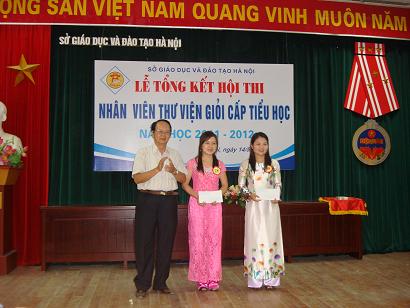 Ảnh: NGUT Lê Văn Quang- Phó Chủ tịch thường trực Hội Khuyến học Hà Nội trao tiền thưởng của Hội cho hai nhân viên thư viện giỏi vượt khó năm 2012