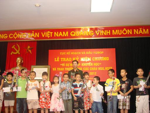 Thiếu tướng - Cục trưởng Cục Kế hoạch đầu tư Phạm Quang Vinh trao thưởng cho các em học sinh giỏi năm học 2011-2012
